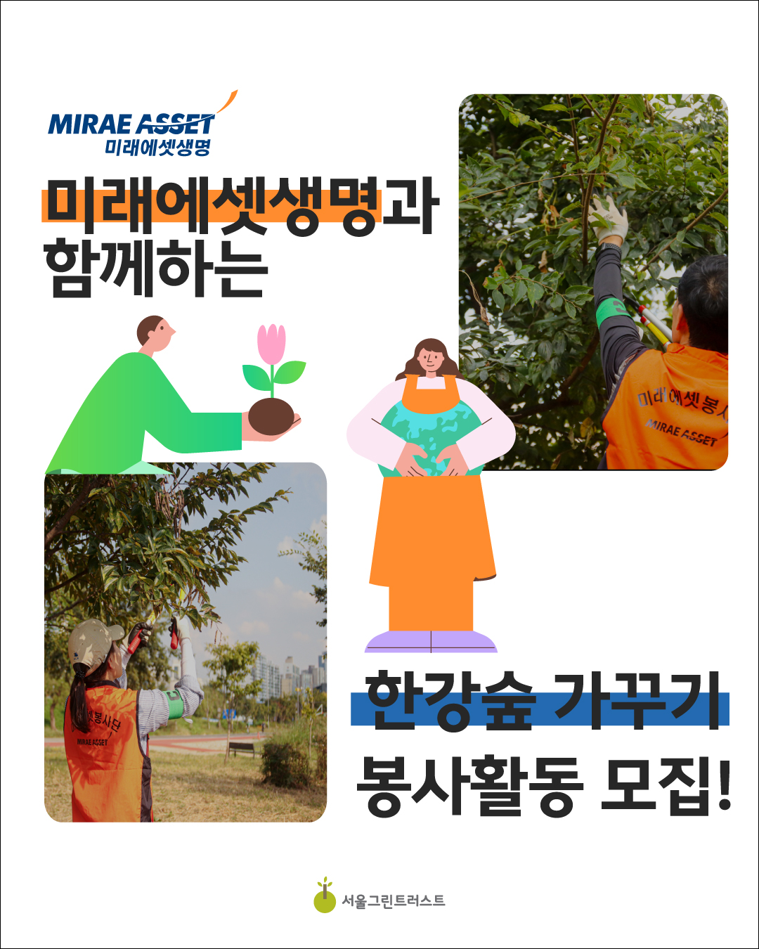 이번 활동은 2019년부터 한강공원입양으로 한강숲과 인연을 이어오고 있는 미래에셋생명의 후원으로 진행되며, 도심 속 자연을 지키고 가꾸는 뜻깊은 실천이 될 것입니다. 함께 걸으며 보고, 가꾸고, 심는 그 순간이 여러분의 마음에도 초록빛 변화를 불러올 거예요. 10월 22일, 한강숲에서 만나요!